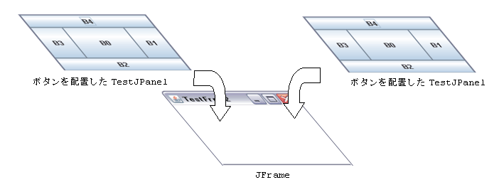 以下で、JButtonを配置したTestJPanel(JPanelのサブクラス)を、