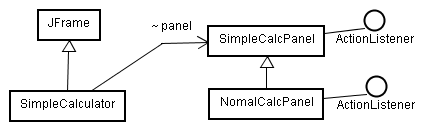 | NomalCalcPanel | SimpleCalcPanelのサブクラスで、演算用ボタンのActionListenerを実装 |