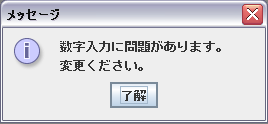 JOptionPane.showMessageDialog(this, "数字入力に問題があります。\n変更ください。");