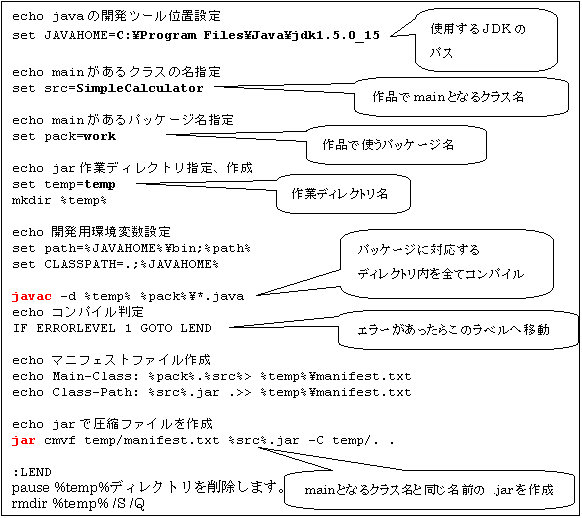 mainがあるクラスの名が『SimpleCalculator』である場合のバッチファイルを