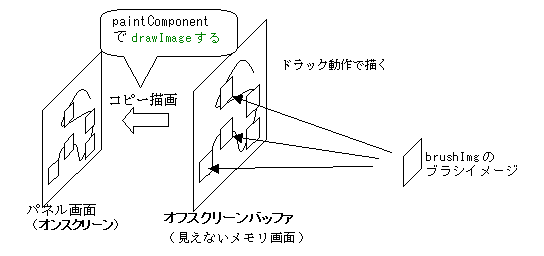 この直接画面に反映していない記憶域は、オフスクリーンバッファと呼ばれます。 以下で、このイメージを示します。(なお、JPanelを実際に画面へ表示する際に使われるコンピュータ内の 記憶域は、オンスクリーンバッファと呼ばれ、これが変更されると表示が連動して変ります。)