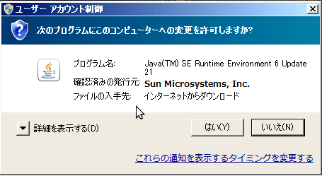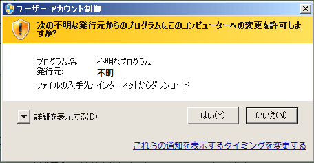 このように発行元が不明な場合や,発行元を信頼できない場合、「はい」クリックしてはいけません。(ウィルスなどが侵入する危険があります。)