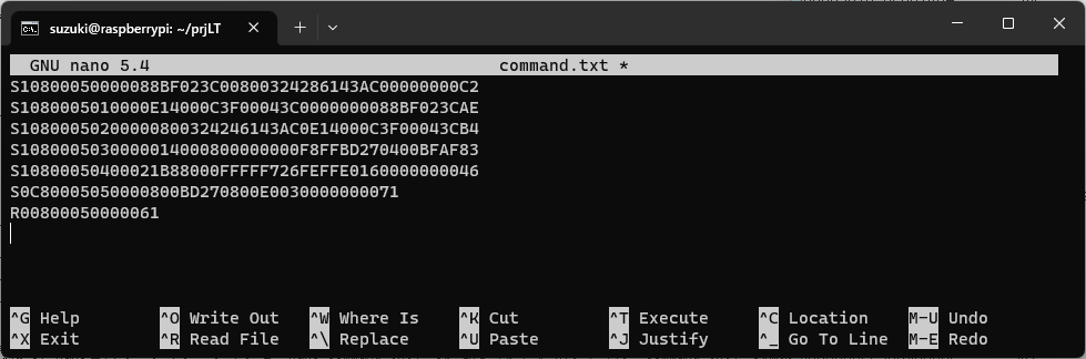 suzuki@raspberrypi:~ $ mkdir ~/prjLT suzuki@raspberrypi:~ $ cd ~/prjLT suzuki@raspberrypi:~/prjLT $ nano command.txt上記の最後で、nanoと言うエディタを「nano command.txt」で起動し、送信ファイル「command.txt」の編集状態にしています。