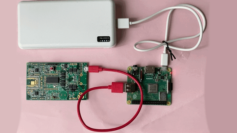 写真の白のUSBケーブルが、[Raspberry Pi 3 Model A+]とモバイルバッテリーを接続して、電源を供給しています。