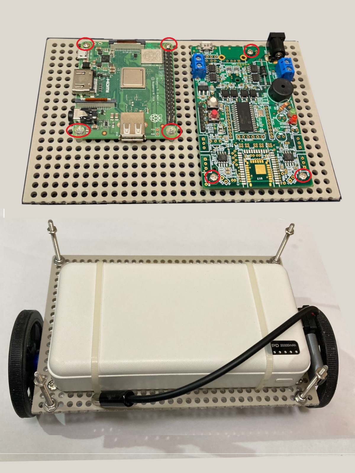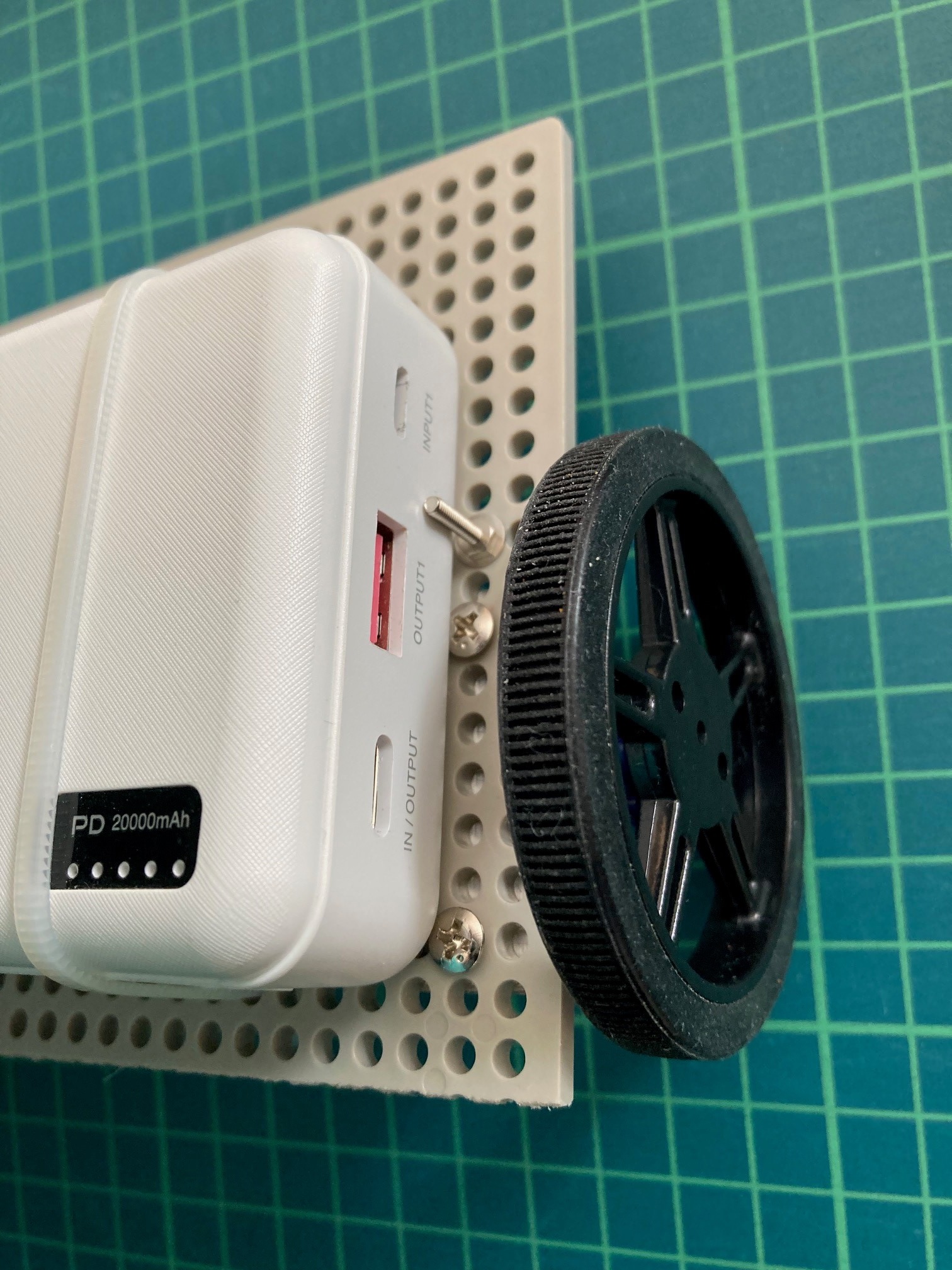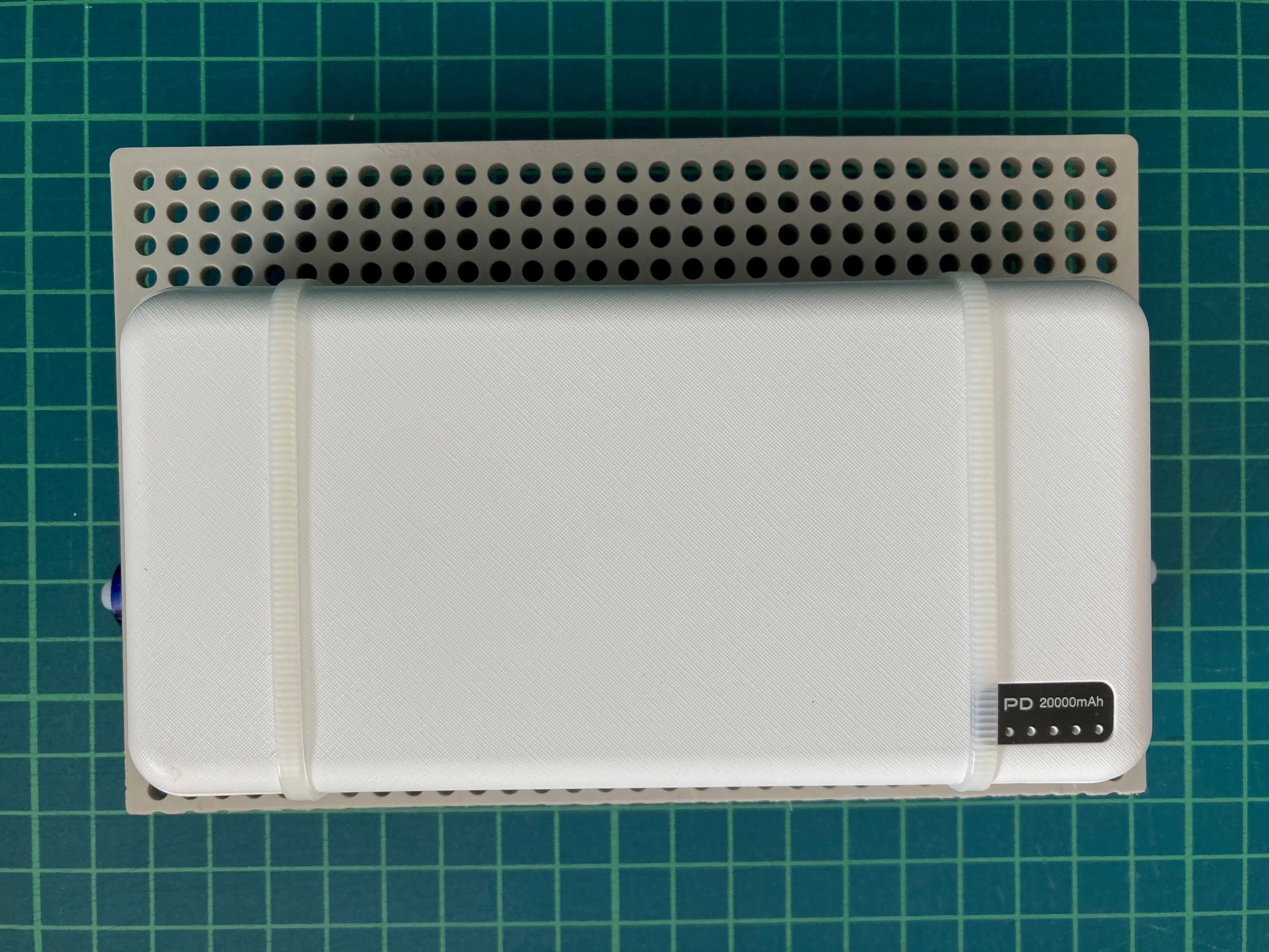 そして、上側にモバイルバッテリー(PD20000mAh)を、結束バンドで取り付けしました。