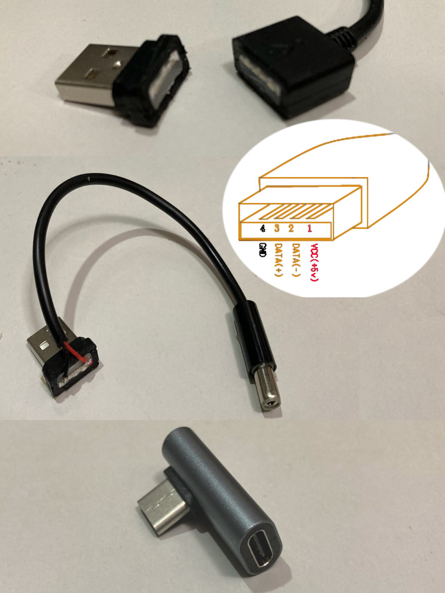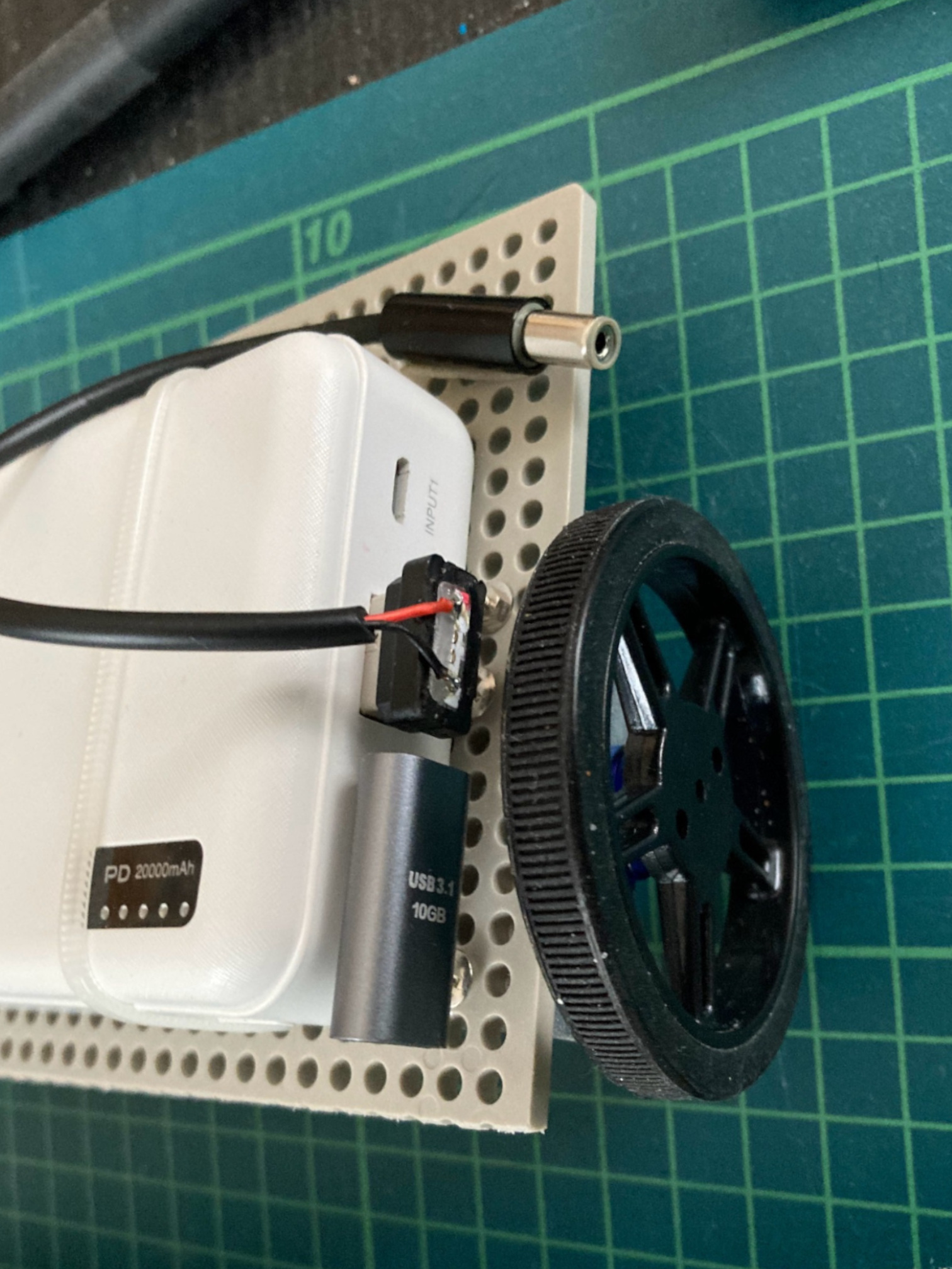 対応するために、TypeーA USBの充電専用オスケーブルを100円ショップで購入し、カット後にケーブルを半田付けしてモータ電源供給ケーブルを作成した。