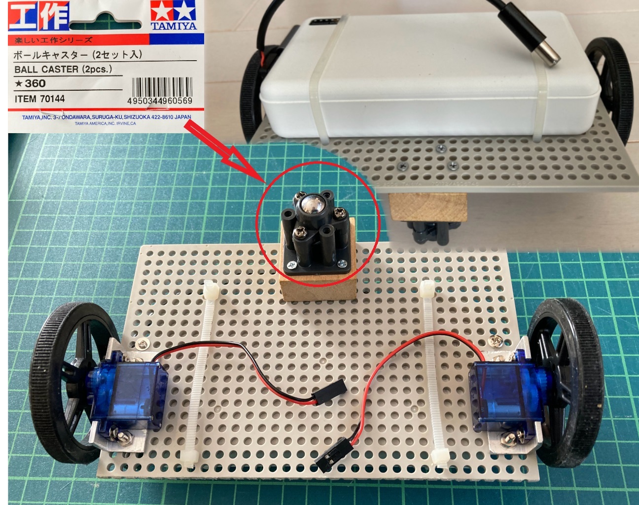 車輪が2つだけではシーソーのように倒れてしまうため、ボールキャスターを次のように取り付けて、全体を支えることにしました。