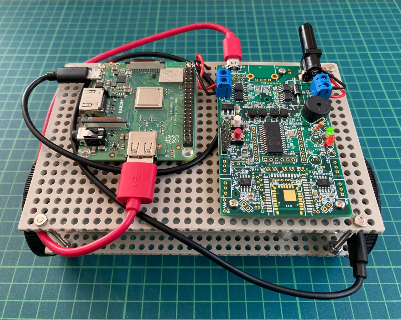 組み立てた基板に、電源源の供給とモータを接続する。