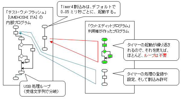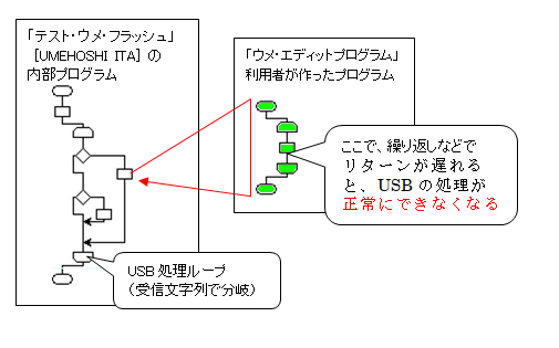 UME専用Hexコマンドが受付可能なUSB通信も正しく動作する作品を 実現するためには、その利用者のプログラム(左記 )で、 速やかに終わらせて赤矢印のリターンが行われるように作り方にします。 |