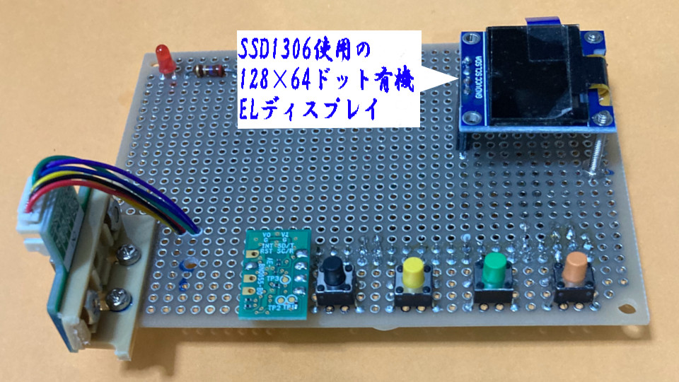 また、0.96インチ 128×64ドット有機ELディスプレイ(OLED) 白色(秋月電子さんから購入)を取り付けしています。