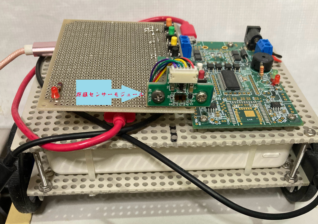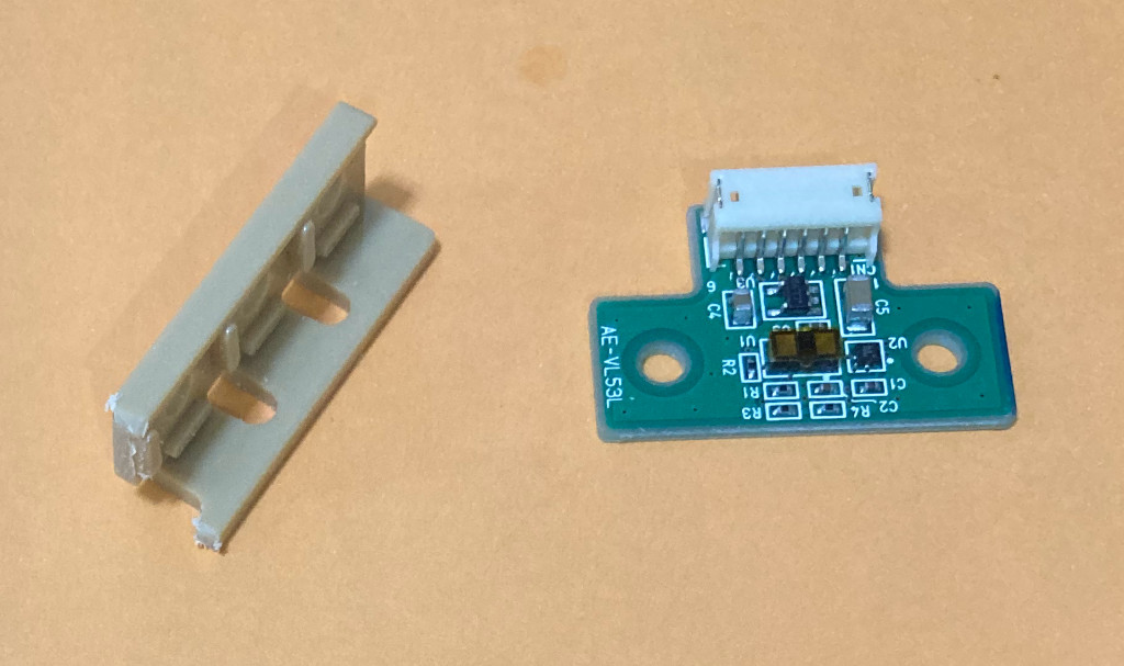 また、VL53L1X使用 レーザー測距センサーモジュール(秋月電子さんから購入)を、手持ちパーツを加工したLアングルで基板に取り付けしています。