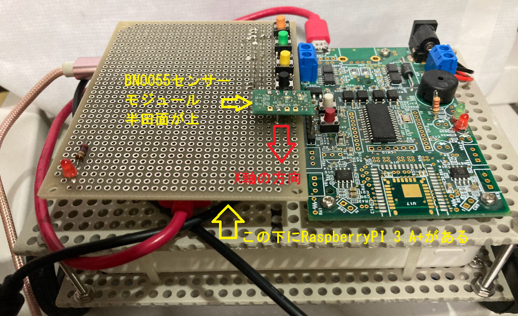 取り付けた9軸センサーのBNO055は、内部MPUを使って各センサー情報を統合して簡単に高度な処理結果を得ることができるFusionモードと、