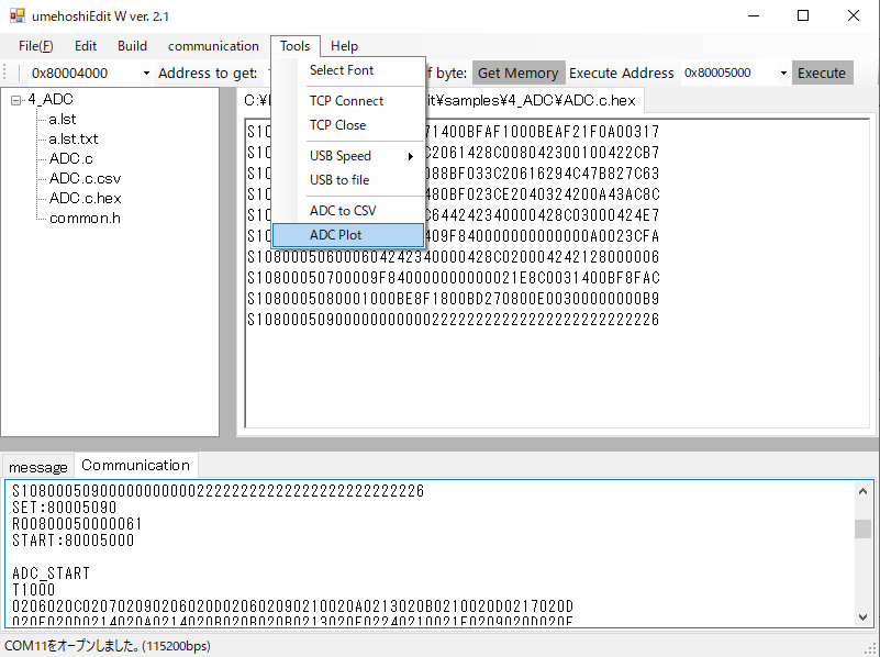 実行の前に、「Tools」メニューの「ADC Plot」を選択しておくとよいでしょう。