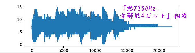 「44100Hz÷6=約7350Hz、分解能4ビット」(11.031Kbyteの再生音) PCでオリジナルファイル16bitを4bitにして、オリジナルのデータ6個から1個を抽出した目標となる音 目標となる音(音質を落としたデータでPC上のPythonで鳴らした音) |