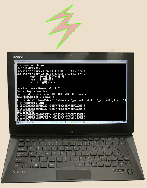 この状態の[UMEHOSHI ITA ]の[RNBT-BEFE]に対して、PCからBluetoothで接続して、キー入力したコマンド文字列や 指定ファイルの転送するpythonのプログラム例を、以下に紹介します。(Windowsプログラムです。)