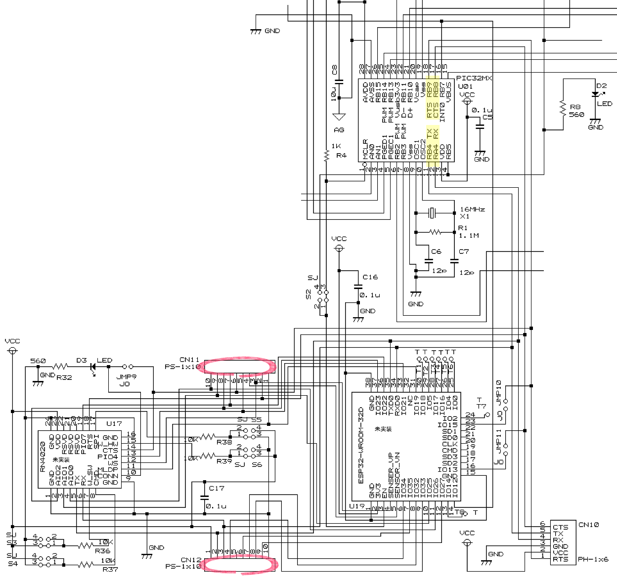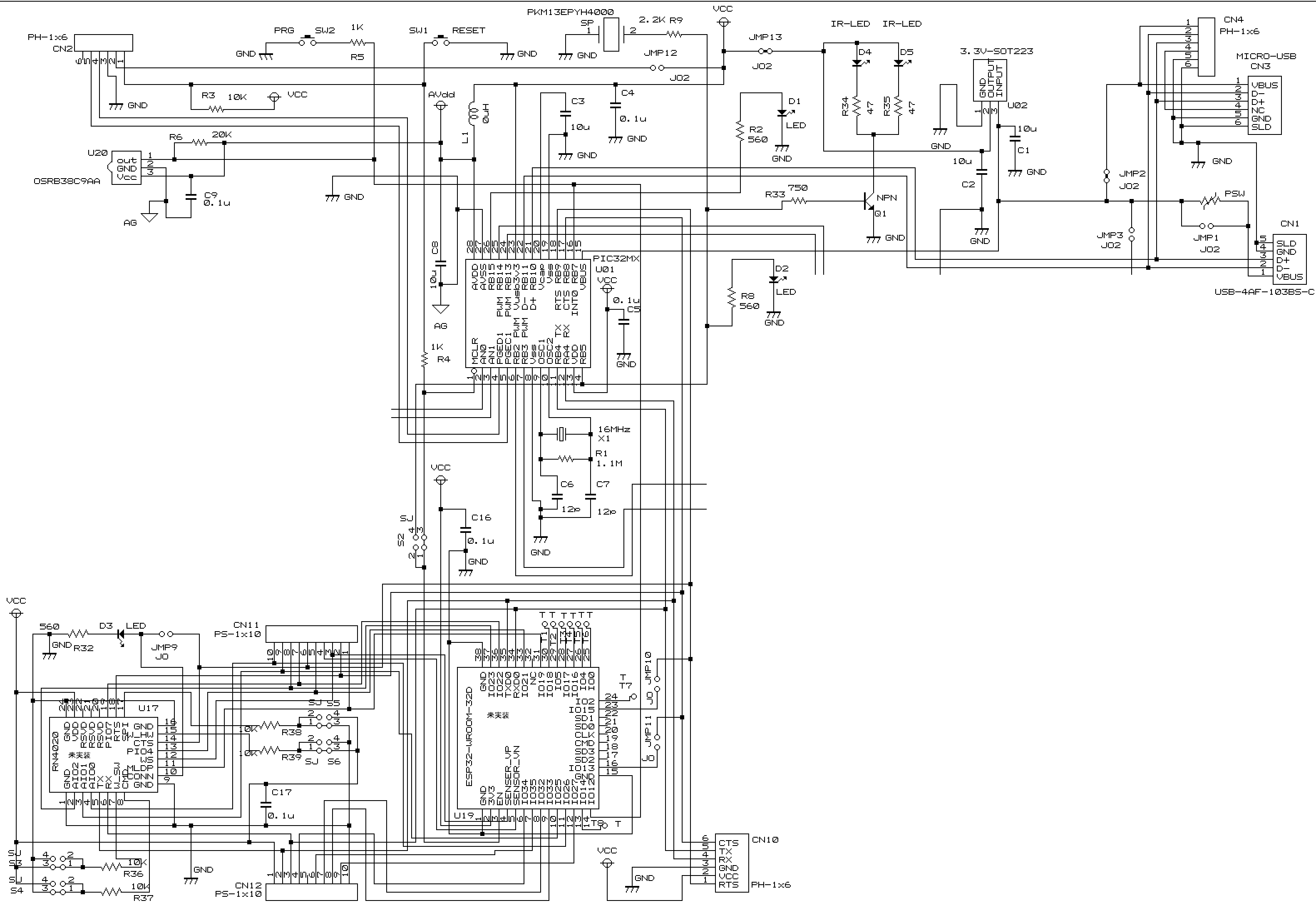 上記で示したCN11とCN12は 2mmピッチ10ピンで、マイクロコントローラ (PIC32MX270F256B-50I/SP)