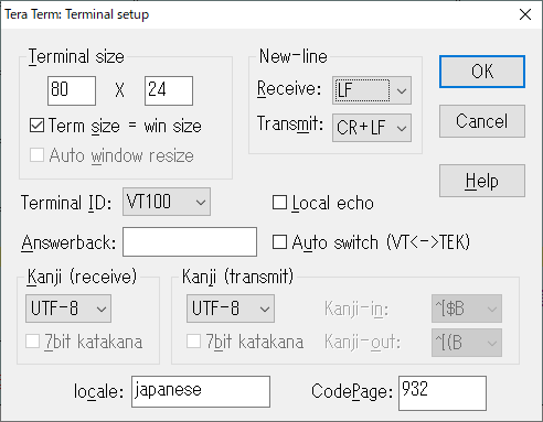 同様に「Setup」メニューの「Tertminal」メニューで、改行(New-line)でReceive:とTranmit:を「CR+LF]にします。