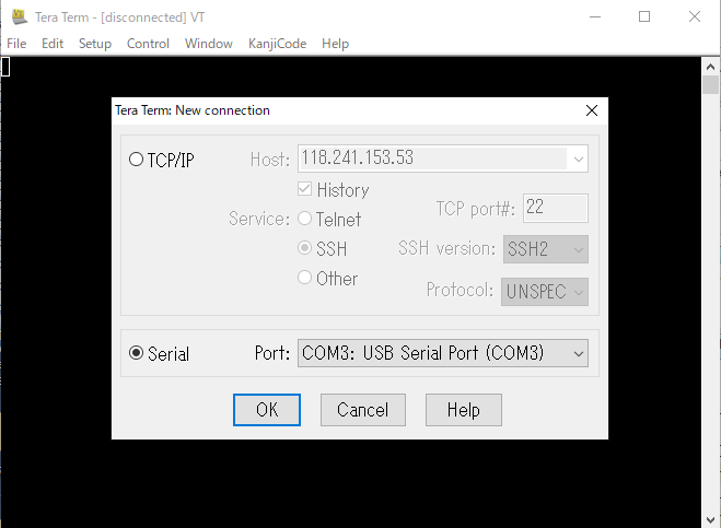 FileメニューのNew Connection より、上記設定のSerialのCOMポートを選択して接続します。