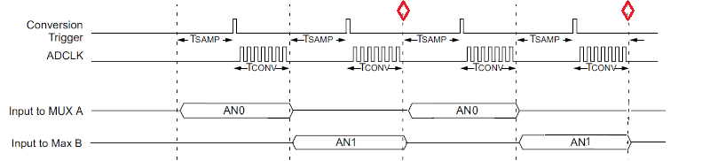 AD1CON2bits.ALTS = 0; // MUX AおよびMUX B入力マルチプレクサ設定を交互に使わない