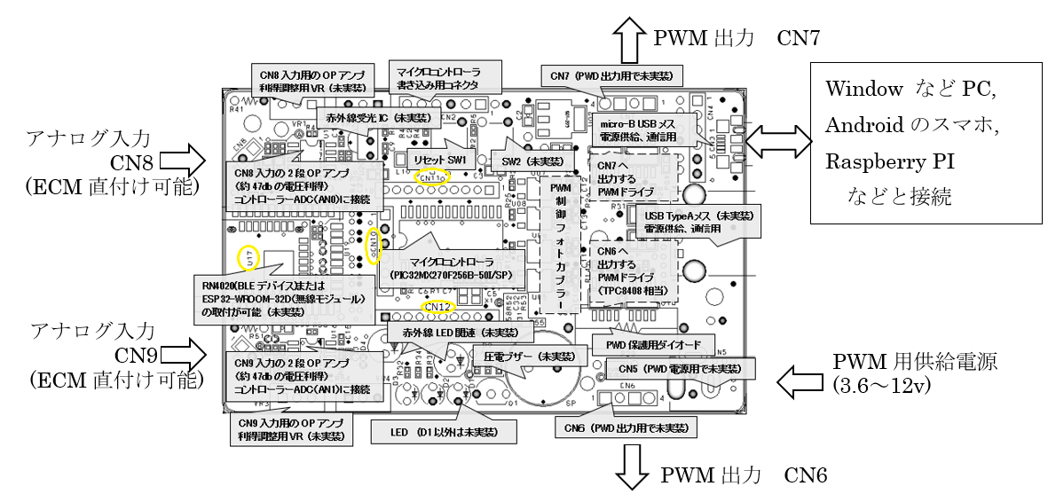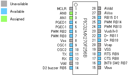 制御用チップは microchip社のマイクロコントローラ (PIC32MX270F256B-50I/SP)で、 Windows PCやAndroid端末などとUSBで接続して、プログラミングが可能になっています。